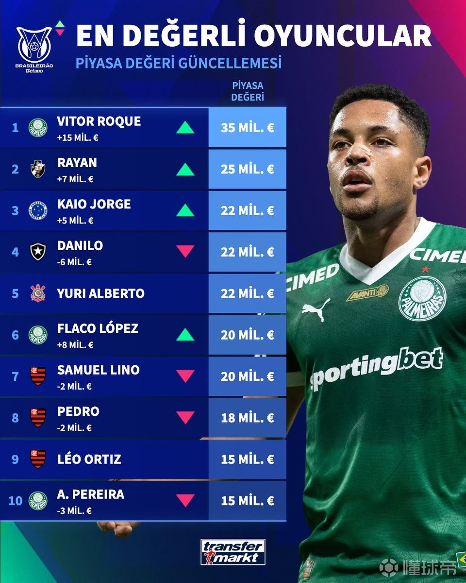北京時(shí)間12月11日,在所謂"權(quán)威"的德轉(zhuǎn)機(jī)構(gòu)更新巴甲球員身價(jià)后,這份充滿爭(zhēng)議的排名終于出爐——當(dāng)前效力于帕爾梅拉斯的巴塞羅那棄將維托爾-羅克竟以暴漲1500萬歐元、總價(jià)3500萬歐元登頂榜首,而同樣掛著"尤文圖斯舊將"標(biāo)簽的克魯塞羅球員凱奧-若熱僅以2200萬歐元并列第三,更諷刺的是,巴西頭號(hào)球星內(nèi)馬爾竟連前十都未擠進(jìn),這究竟是專業(yè)評(píng)估還是商業(yè)炒作?德轉(zhuǎn)更新后巴甲球員身價(jià)TOP10:一場(chǎng)荒誕的數(shù)